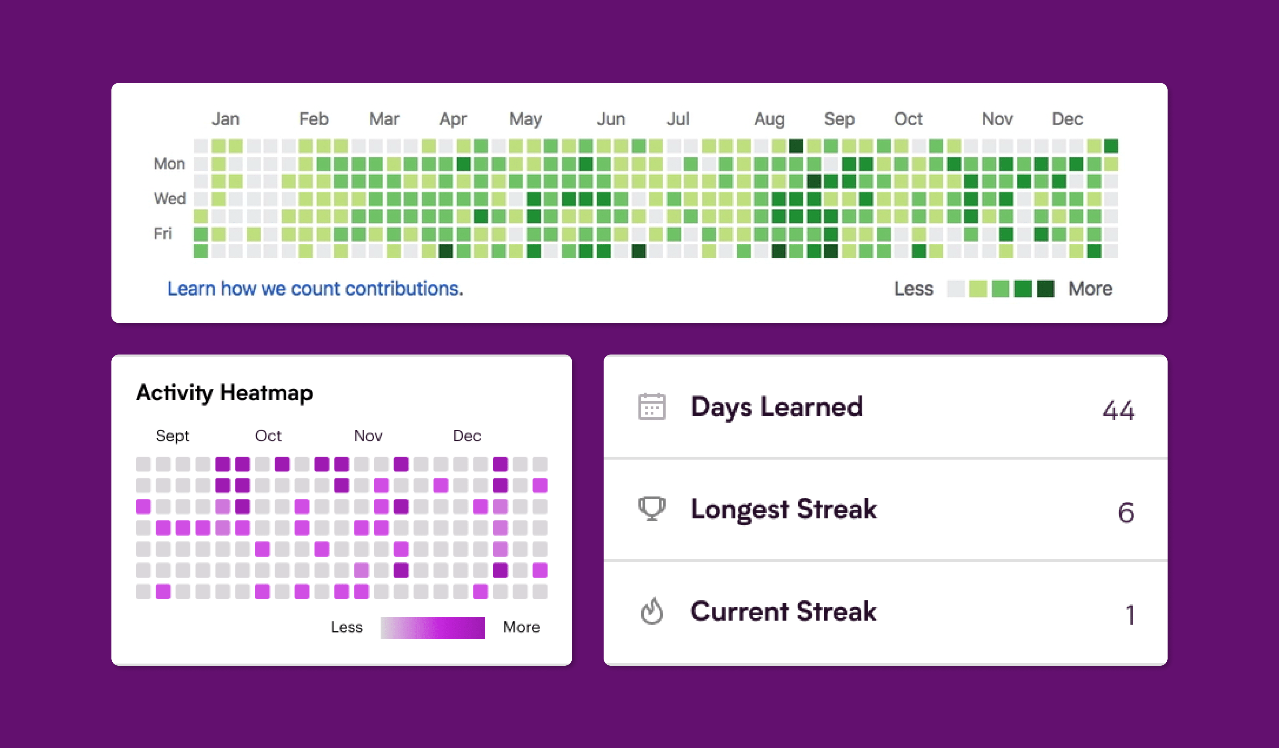 Most products we looked at (i.e. Headspace, Duolingo) utilized streaks to track continuous usage. Nikki took inspiration from Github to create an activity heatmap, which represented how many tasks a user posted each day in Scenius.