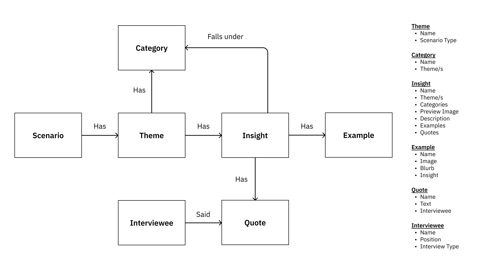 This process also helped inform the design of the websiteโs content management system. Thanks to knowing how I wanted to structure and visualize the research findings, I was able to determine how to group these into collections of content, along with the relation of these collections to each other. To envision these collections and their relationships, I created a simple entity relationship diagram (ERD). Thanks to this ERD, I was able to have an easier time developing the website in Webflow.