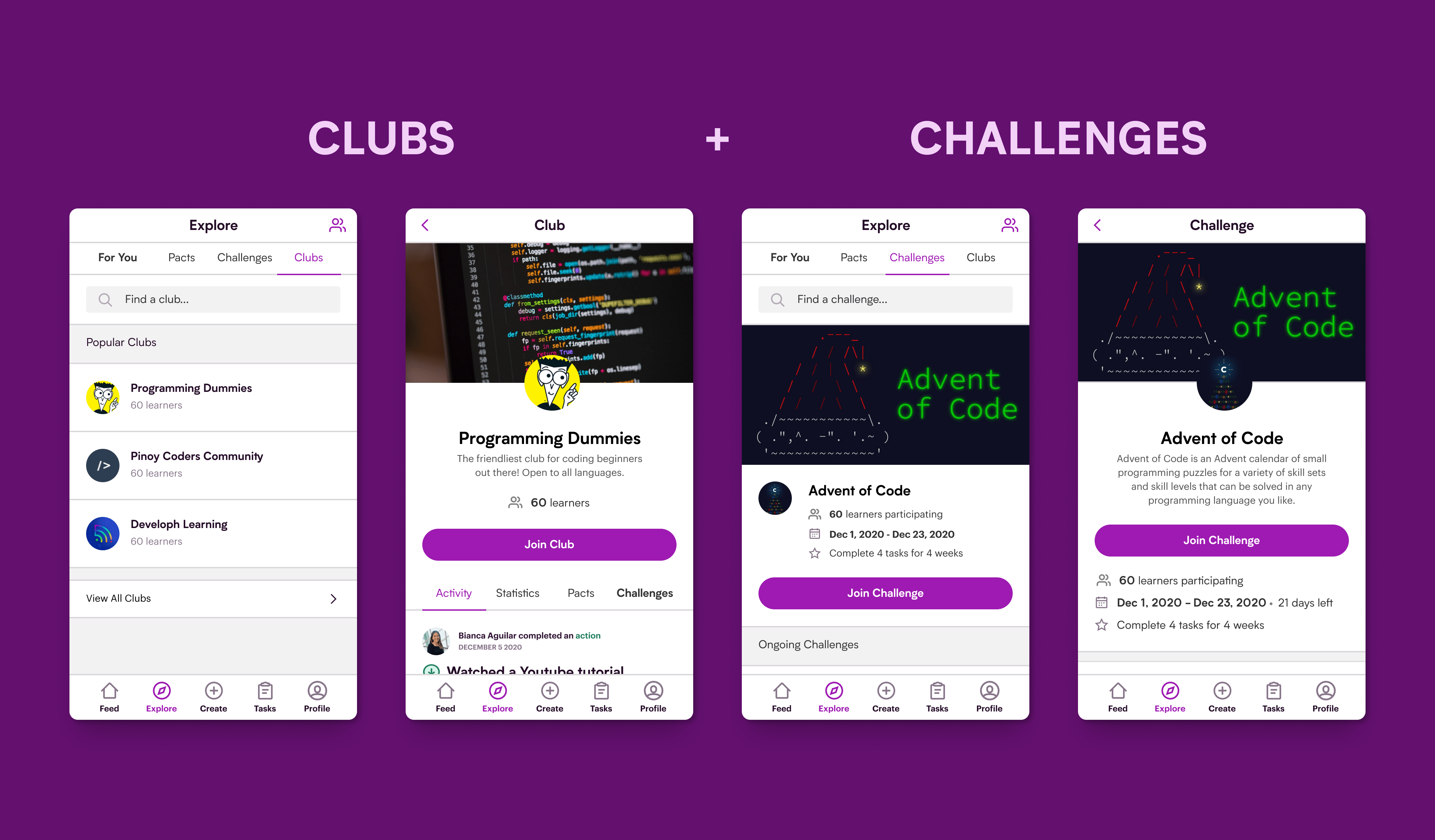 Aside from public posts, users can also connect with others through the Explore tab. They can search up other pacts, join clubs centered around similar interests and locations, and engage in challenges: time-bound pacts hosted by clubs. This tab was modelled after Strava's interface.