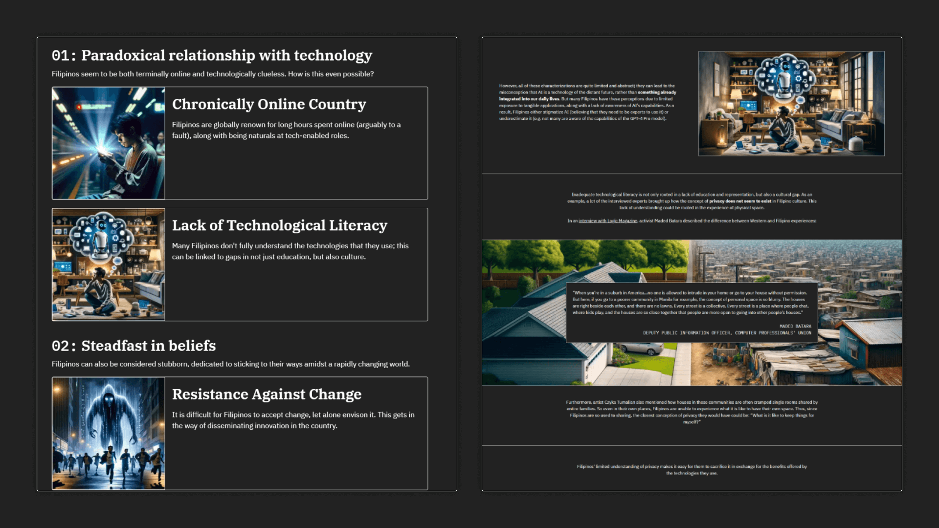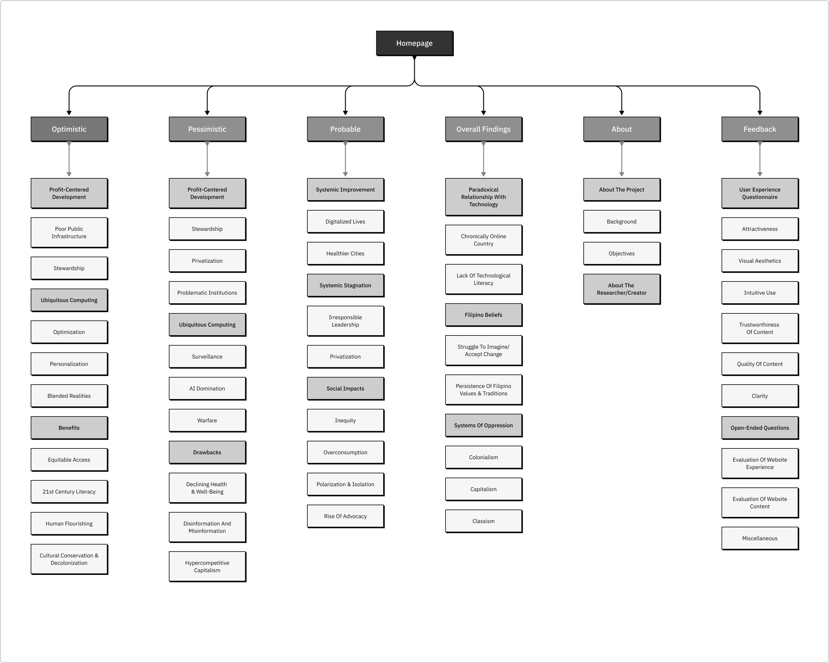 For this initial iteration, I decided to make my target audience Filipino knowledge workers. While I knew that an informative website was not capable of engaging the entire Filipino population, I also believed that tech workers weren't the only ones who could benefit from this. ย Knowledge workers are not only literate enough to access the website, but they are also undeniably afflicted by technological imaginaries, given how their roles are enabled by technology. Moreover, I believe that they have an active role to play in shaping the future for all Filipinos, whether or not they're working in the tech industry. Thus, gaining more critical awareness would be crucial for them.