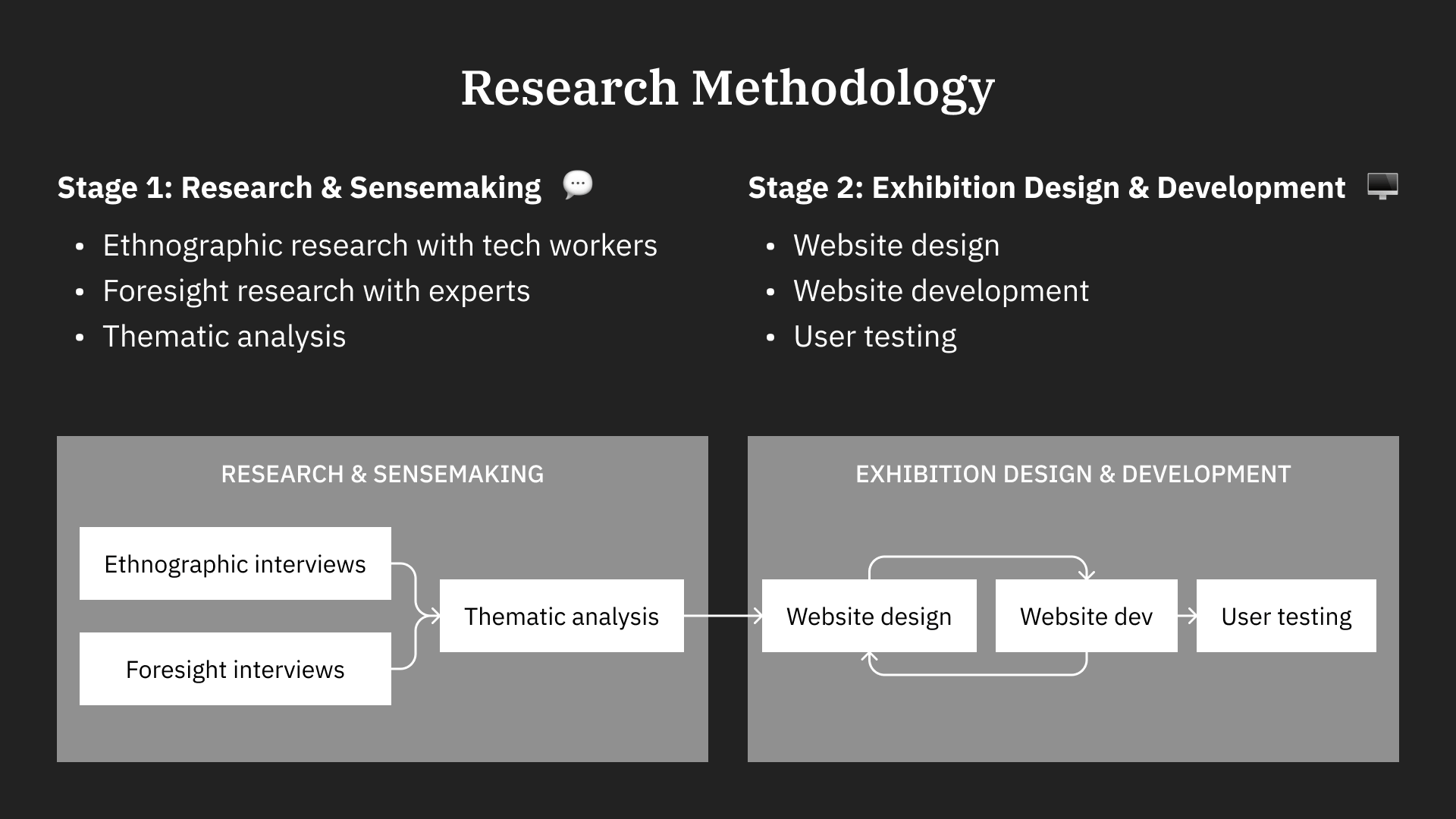 Next, I worked towards my second objective (materializing imaginaries) by designing and developing the virtual exhibition. Speculative and critical design were utilized to visualize the future scenarios, while UX design was used in creating the container for these scenarios. After this, I used Webflow to bring these designs to life. The design and development of the website was a circular process, with me often cycling between stages. Finally, once I had an MVP of the website, I conducted user testing with a small sample of people.