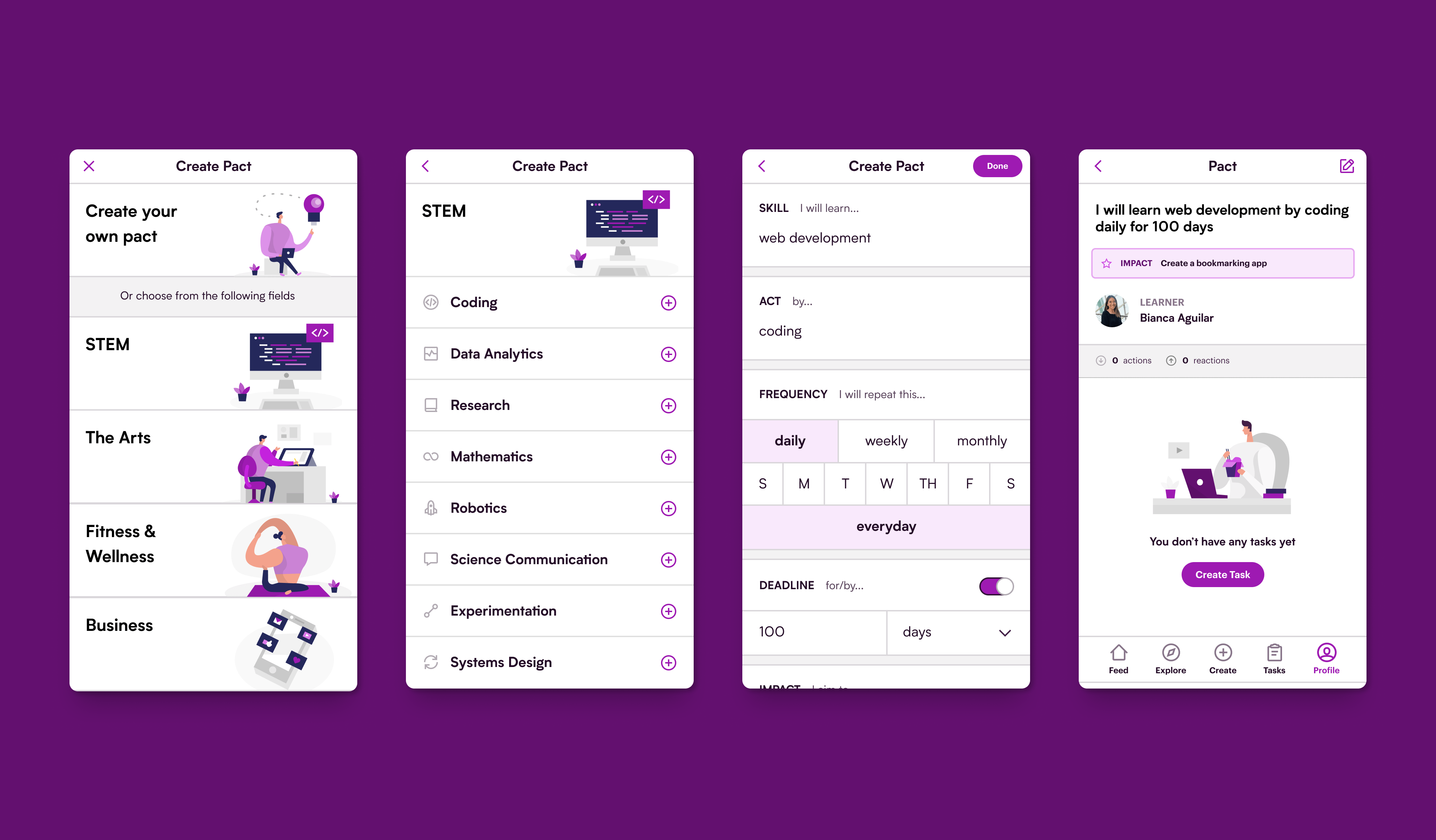 When a user first opens the app, they are given a rundown of what the app offers. Then, they are directed to create their first pact. This was inspired by the creation process of popular habit tracking apps.