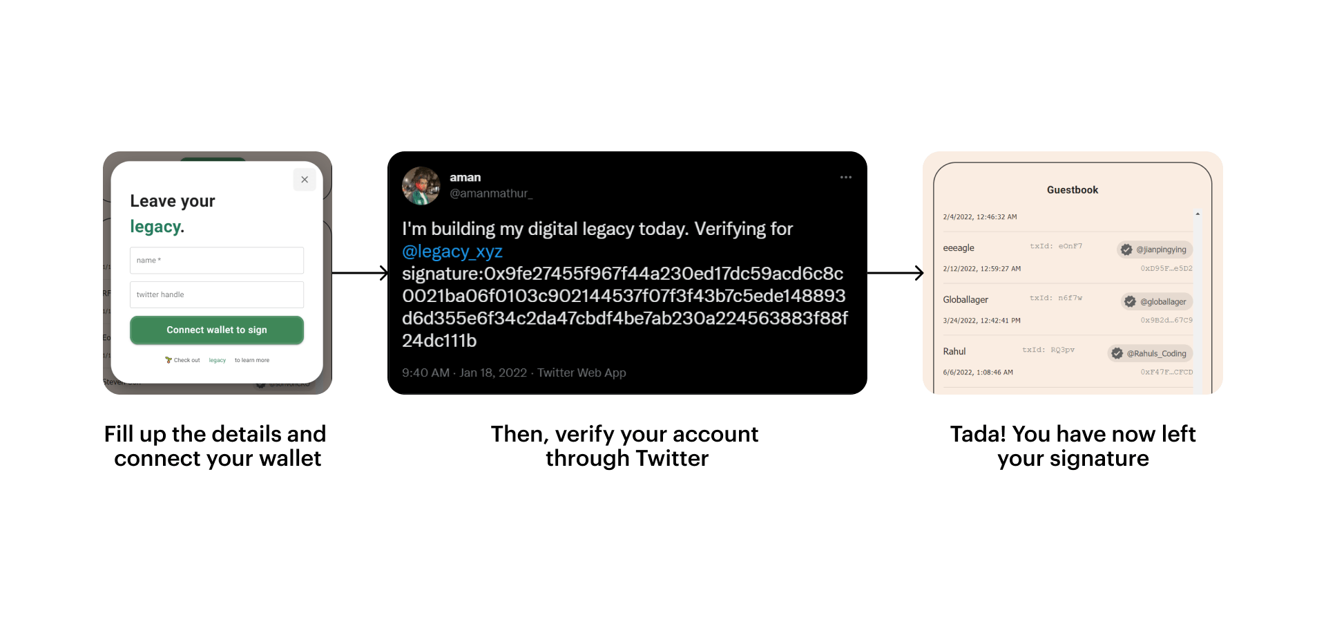 At the end of the whole experience, people can sign a library card. This was inspired by projects like A Declaration of the Interdependence of Cyberspace and Legacy.xyz, which both showed how digital signatures could be done through crypto wallets. By connecting a wallet + posting a verification tweet, one can create a signature that truly belongs to them. This process also worked as a form of marketing; seeing verification tweets on their timelines made others curious about these projects. We hoped to do the same for the Lexicon.