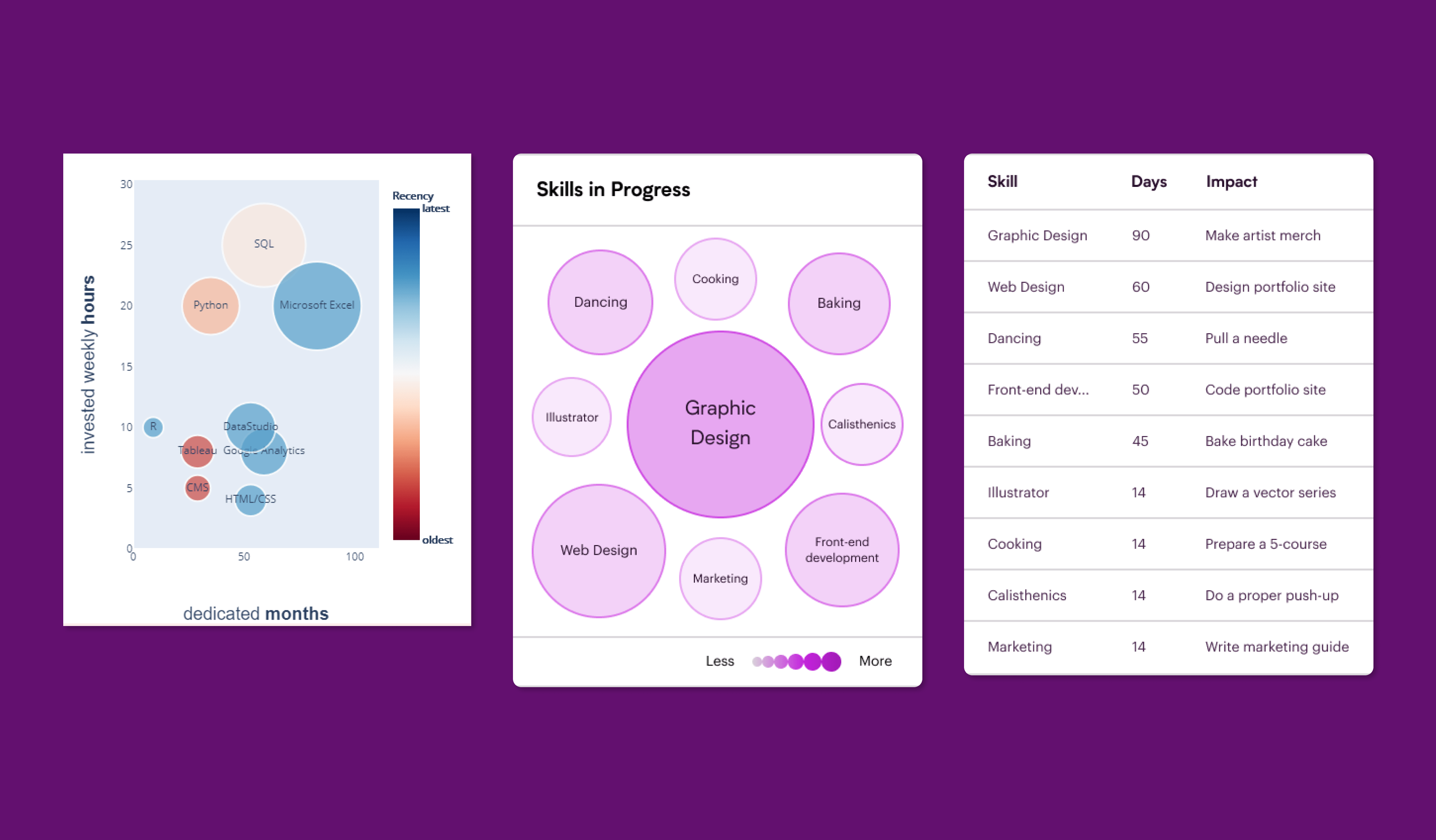I eventually settled on bubble graphs; these were inspired by the skill maps of interactive CVs. Compared to the complex graphs were looking at, this was the most flexible option; it could accommodate a diverse set of skills instead of being limited to just one This visualization is based on the days; the more you commit to a certain skill, the darker and bigger the bubble will get. A table below this graph gets more into the details.