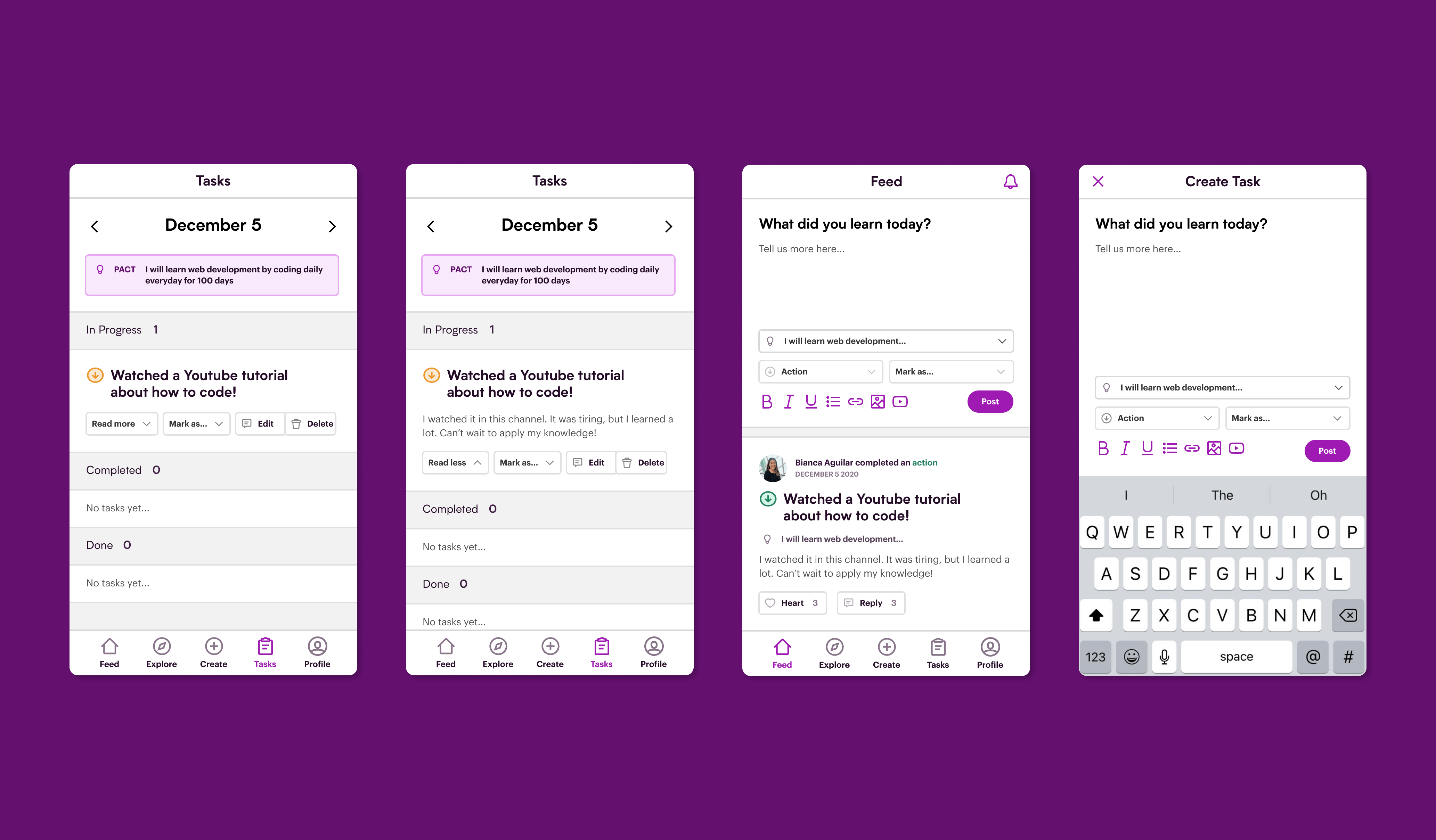 Once a pact is created, a user can log related tasks with descriptions and statuses (e.g. "In Progress). These tasks are also posted in public, where they can be replied to (perfect for feedback and discussion). I took inspiration from social media platforms centered around short posts like Twitter and Makerlog.