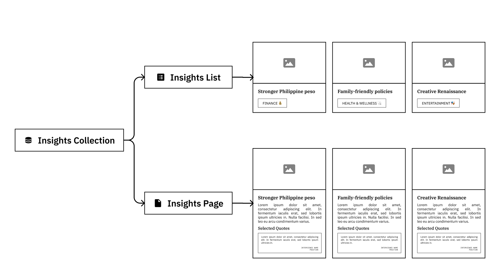 I chose to use Webflow because it is not only a no-code website builder, but also an integrated content management system. Once I created my 6 collections: Themes, Categories, Insights, Examples, Quotes, and Interviewees, I was able to connect them to existing design elements on my site, which Webflow would then automatically fill up for me. For instance, after building a list of Insight cards, once I connected the Insight collection to it, Webflow automatically populated it with data from my collection. Furthermore, Webflow automatically creates template pages for each collection too; once I designed the page template for Insights, I was already able to see populated data there.