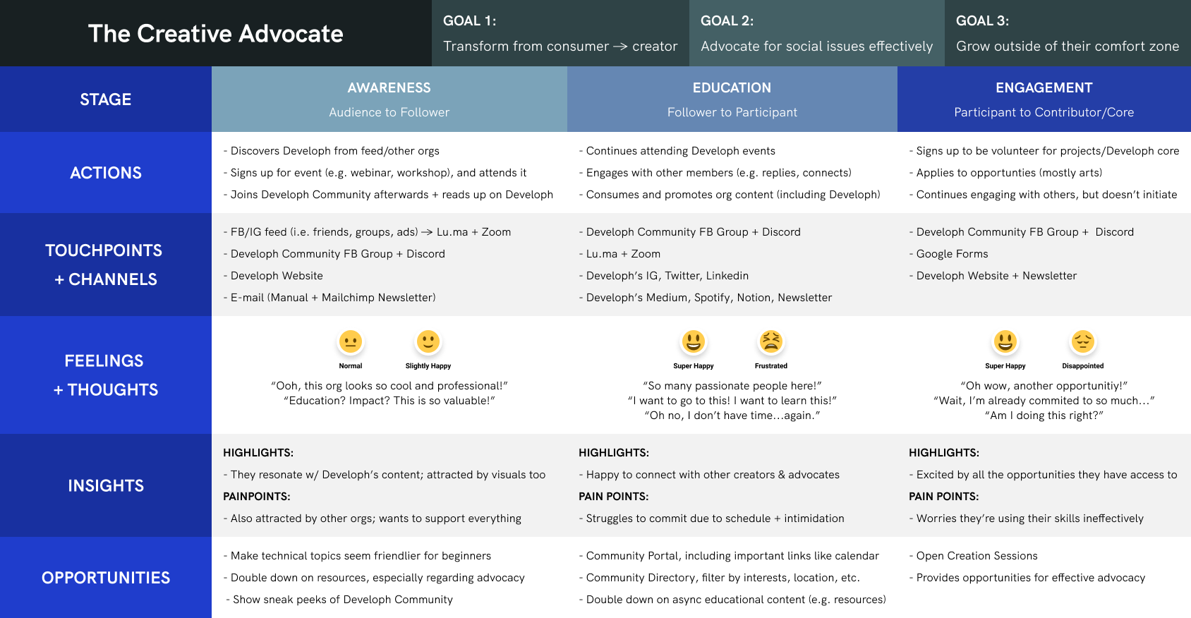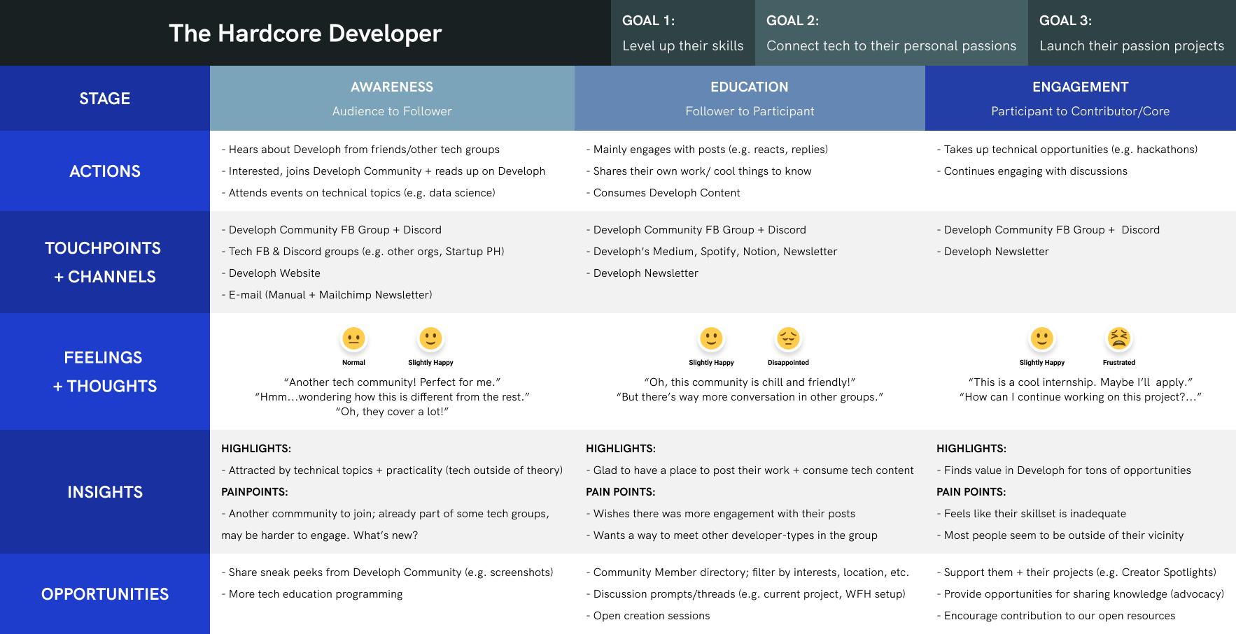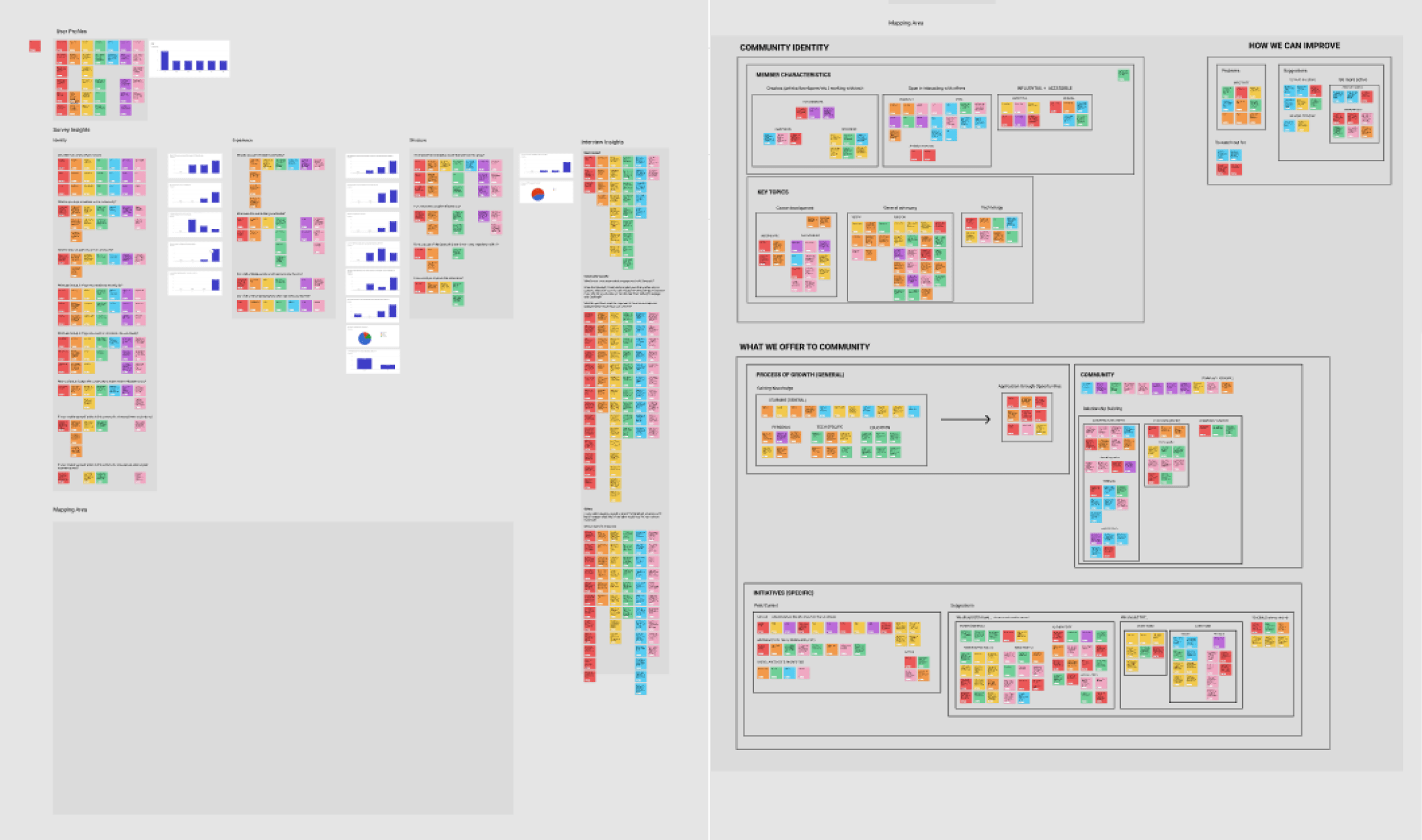 First, we created a survey. Questions were centered around themes of identity, experience, and structure, taken from the Community Canvas framework. This was then disseminated in the Facebook group. We then contacted respondents who opted in for a 1-hour interview. Finally, the Developh team worked together to analyze and cluster the data we gathered through affinity mapping.