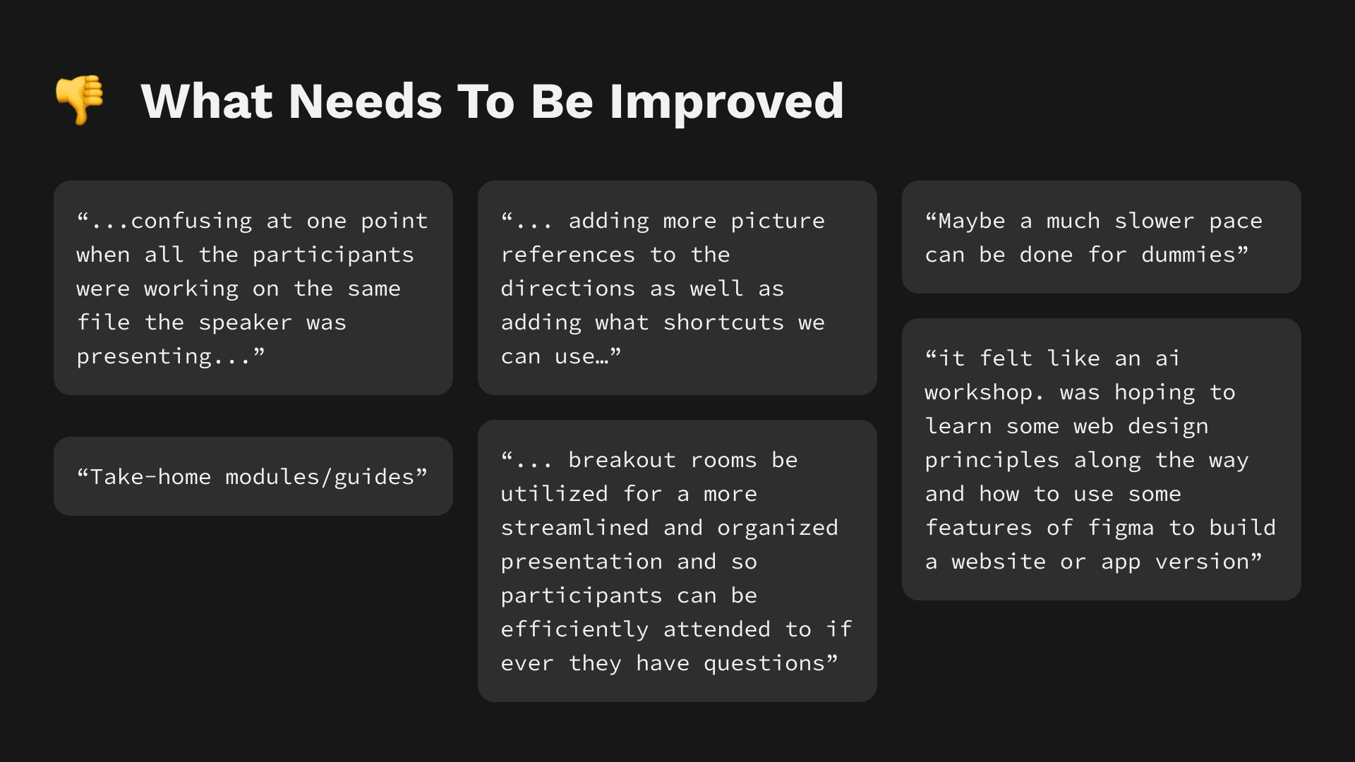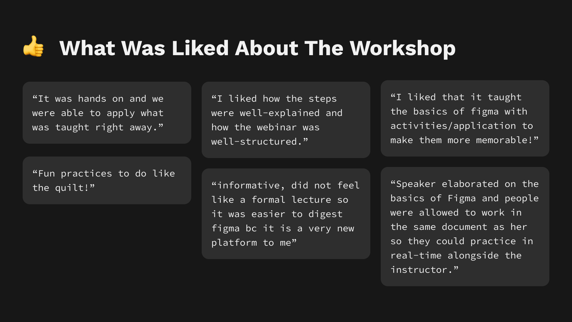 If there was one thing I could've done better, it would've been the onboarding for the activity. Initially, the students didn't know what to do. Many of them were new to Figma so they didn't know how to navigate the interface. I had to do a quick demonstration in order to get the ball rolling. If I had the chance to redo this workshop, I would've prepared simple instructions for using Figma along with how to do a website study. That way, there wouldn't be as much confusion.