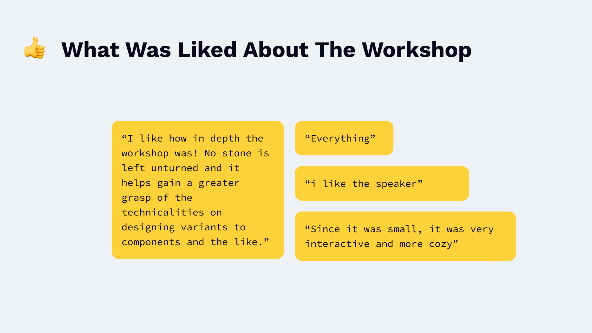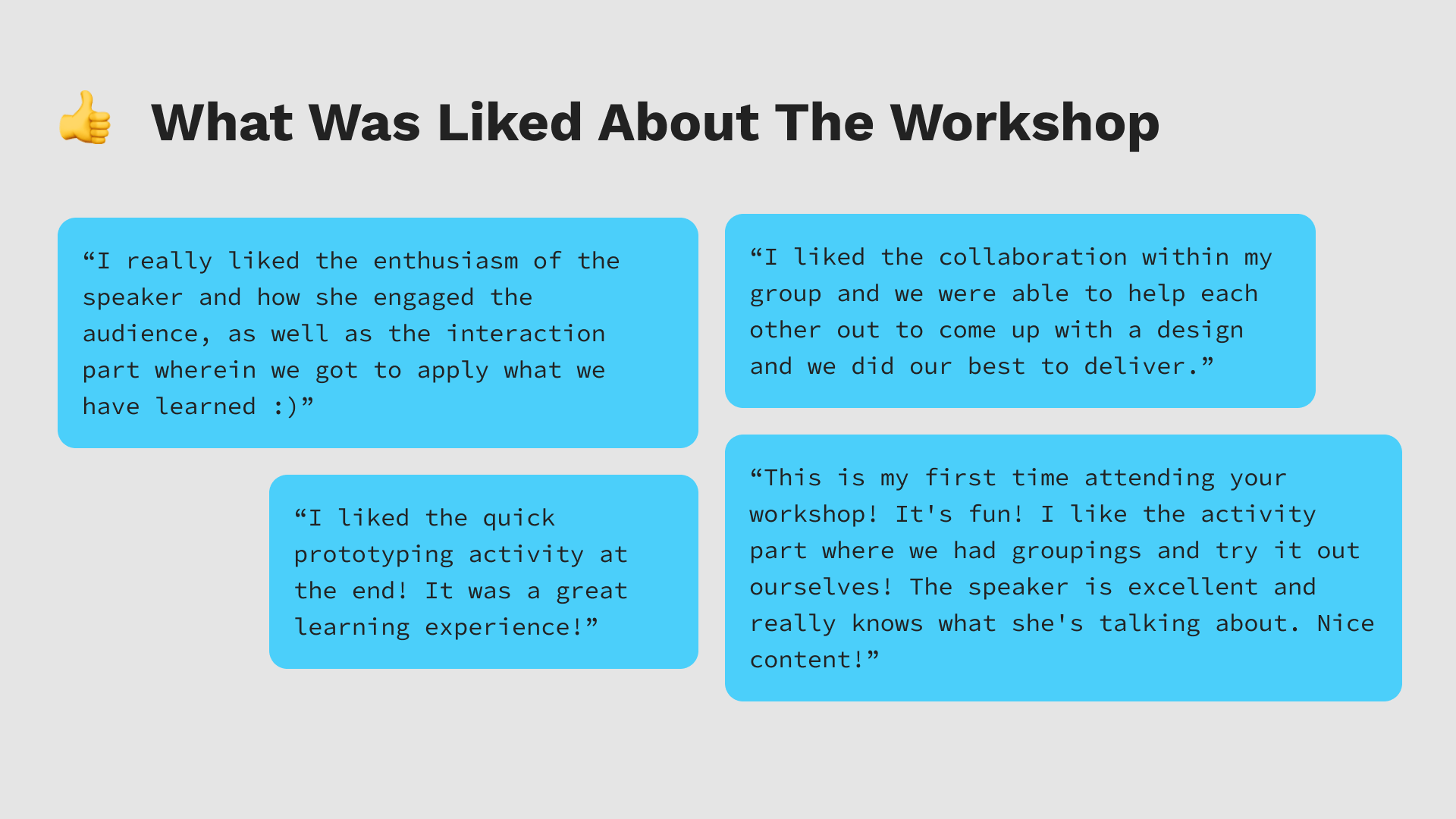 Turnout varied wildly; some workshops would have around 20 people attend, while others reached as high as 100+. What surprised me too was how most respondents ended up not being affiliated with User Experience Society or Ateneo; it showed me just how much people wanted to learn design. Based on feedback, the workshops were consistently rated high across different aspects (i.e. lecture, activity, speaker, logistics, overall experience).