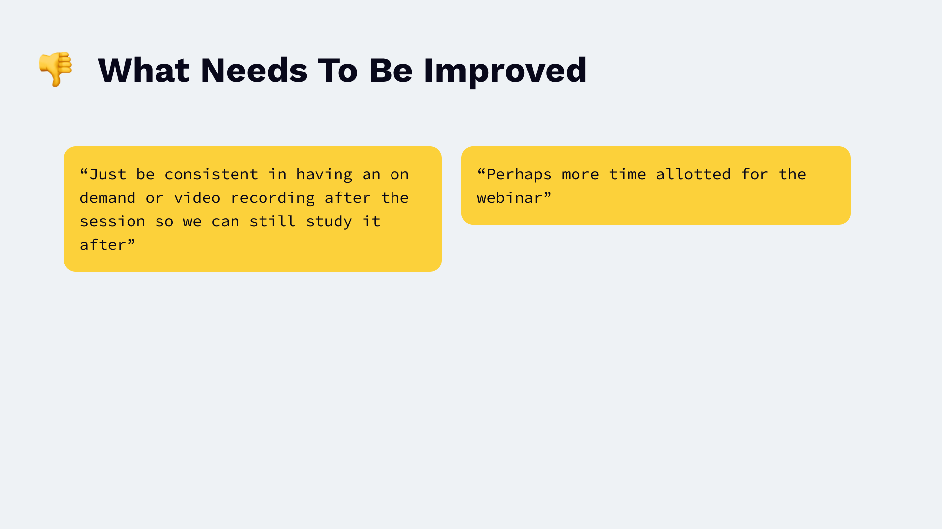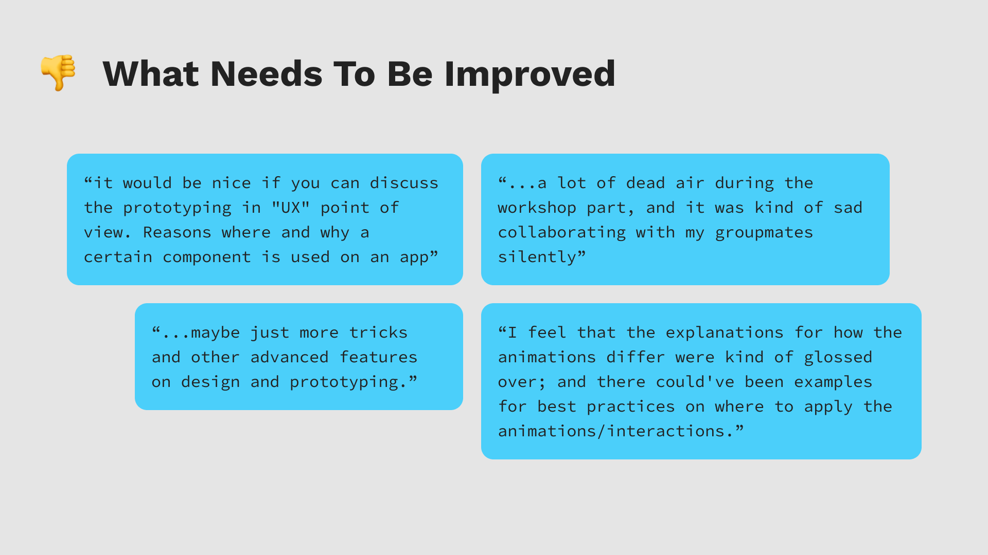 Another downside of the workshop format is that it's one-time only. I want to ensure that students can continue learning even after the workshop. Aside from providing take-home modules, this can be tackled by uploading recordings as soon as possible. This way, not only workshop attendees can review; those who weren't able to attend also get a chance to learn. I'm also planning to make an internal guide on online workshop design and facilitation so that future User Experience Society core can replicate this.