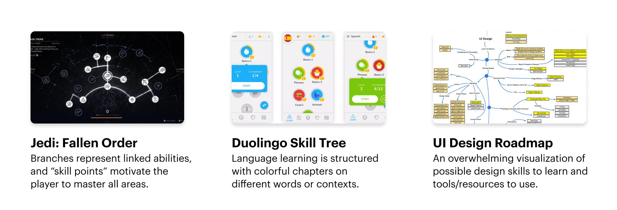 However, we knew this wasn't sufficient for communicating depth/breadth across different skills, so we started exploring other visualizations like skill trees and roadmaps.