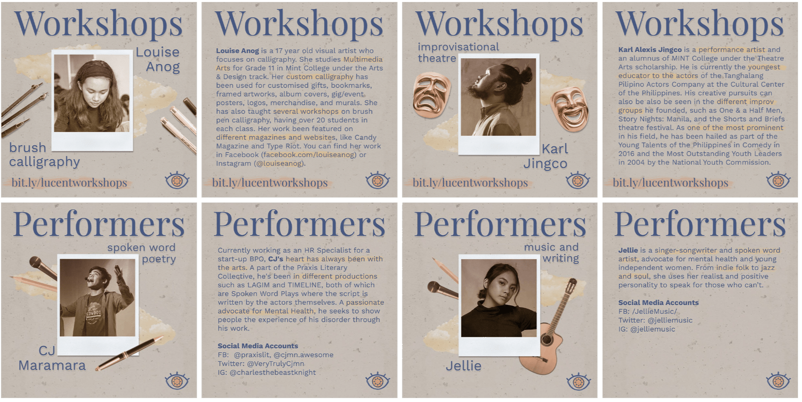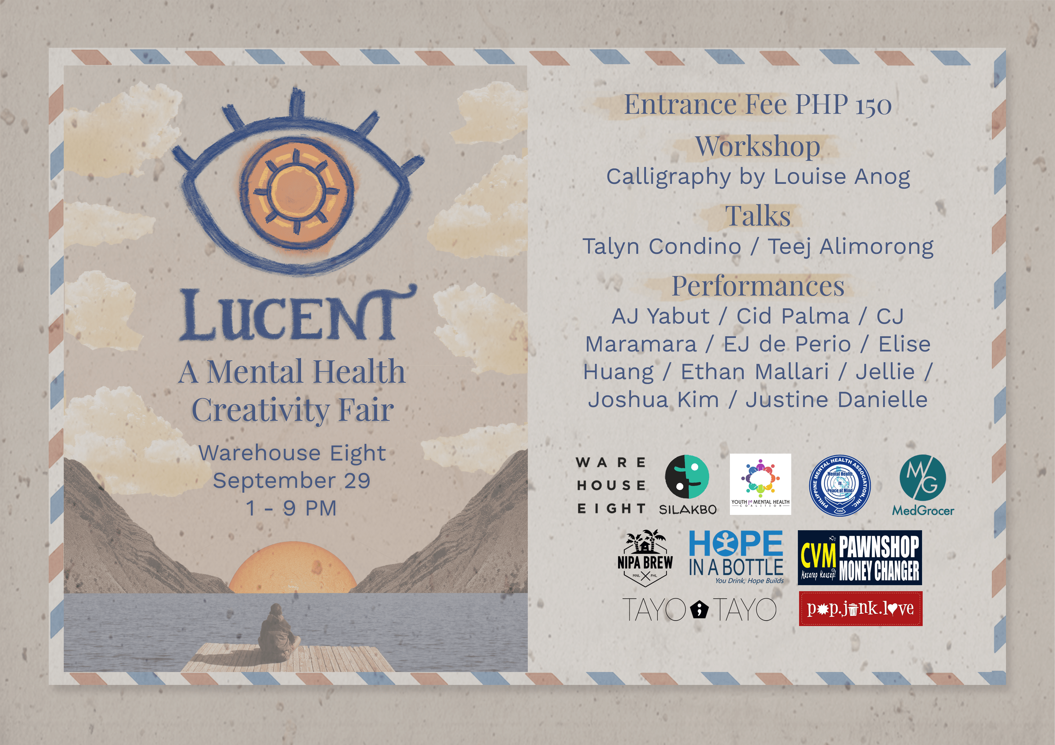 Lucent (previously named Luna) was an annual creativity fair that aims to promote mental health awareness through art, workshops, talks, and performances. It was collectively organized by local mental health organizations (i.e. Youth for Mental Health Coalition, Silakbo, Tayo;Tayo, and Tala).