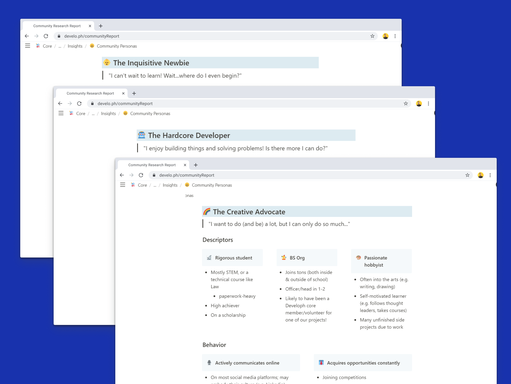 At the time of this research, the group had tons of untapped potential. Most of our projects were sparked from our intuitive urges, but we weren't sure if these catered to the needs of our target audience. Because of this, we wanted to conduct foundational research that would empower us to make data-driven decisions in the future.