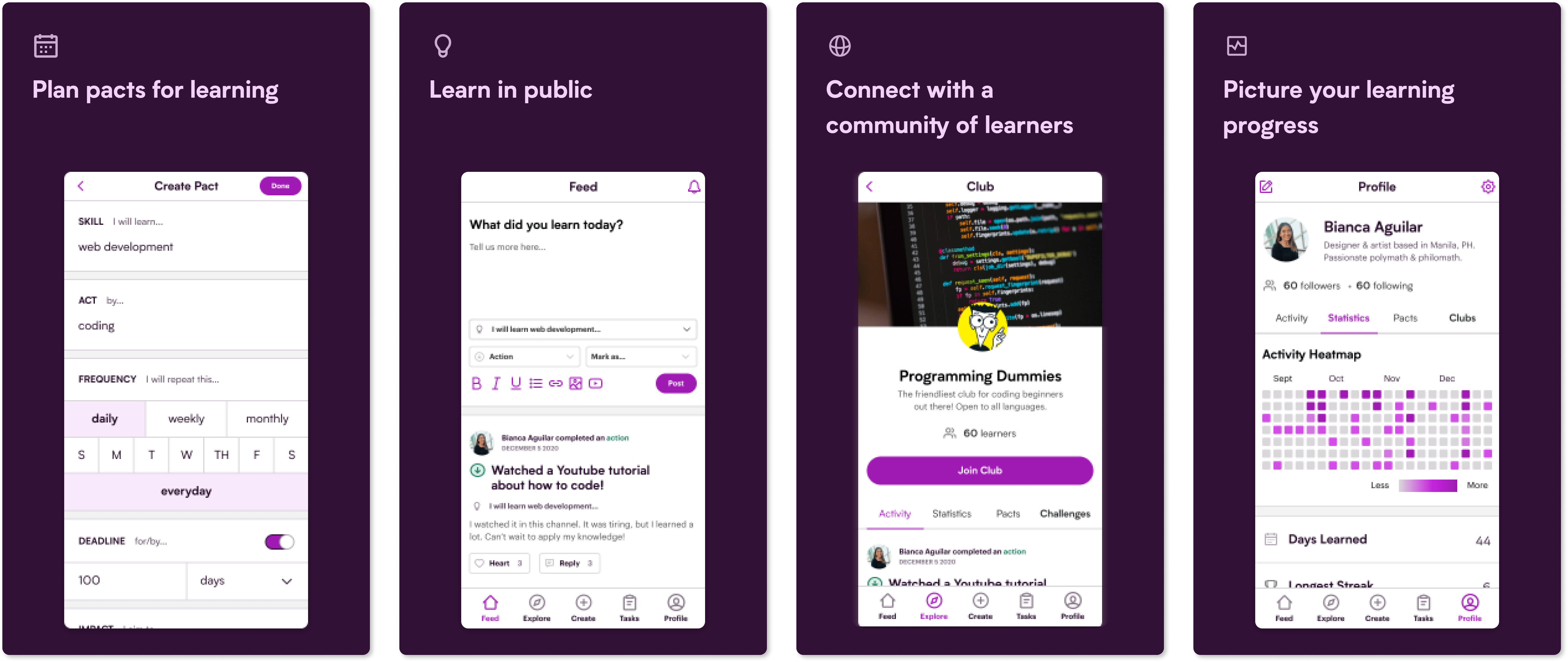 Finally, the user's profile gives an overall picture of how they are as a learner. You can see their activity, pacts, club, and statistics: data on what they've been learning and how long they've been working on it. This last part was a tricky design challenge: how can we visualize learning?