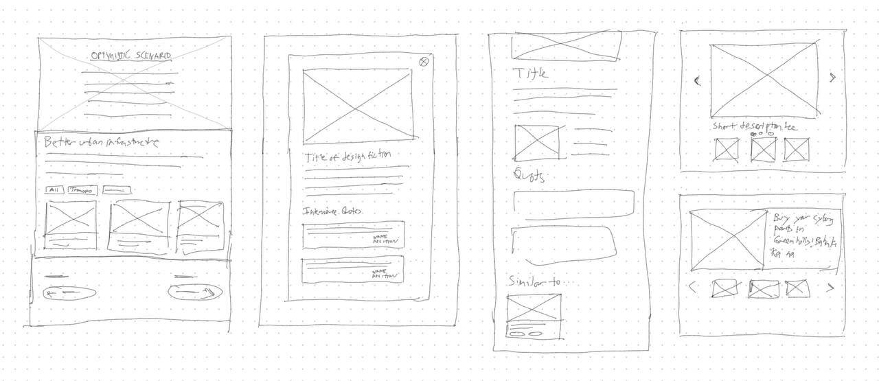 To start translating the research insights into a website-ready format, I began by constructing a sitemap. At the same time, I drafted sketches of the website to help with envisioning specific page structures, given that I'm a visual thinker. This process helped me come up with the general structure of a scenario page: Scenario โ Theme โ Subtheme โ Insight.