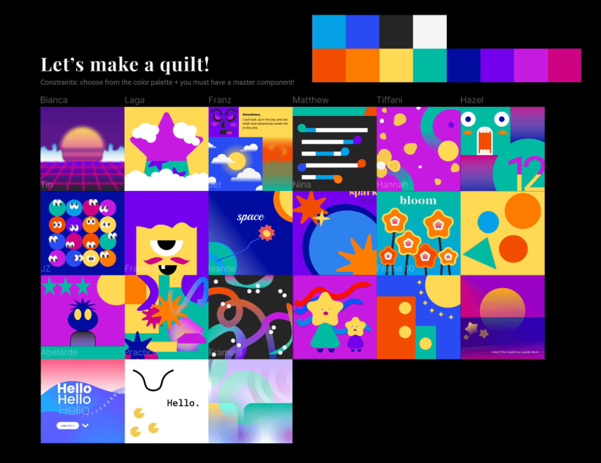 At the end, I had everyone take part in a Figma Quilt; each student had to contribute one square frame. The only constraints I had were to make use of a prescribed color palette, and to use components (if possible). Here's what we all came up with at the end!