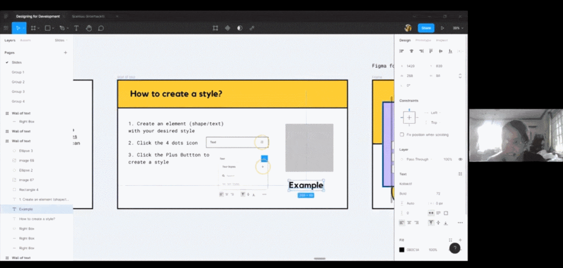 Here, I took an unconventional approach: I invited the students to simultaneously try out what they were learning while I was presenting in the Figma file. This was for the mini-activities I inserted throughout the talk, where the students were asked how to replicate a certain design.