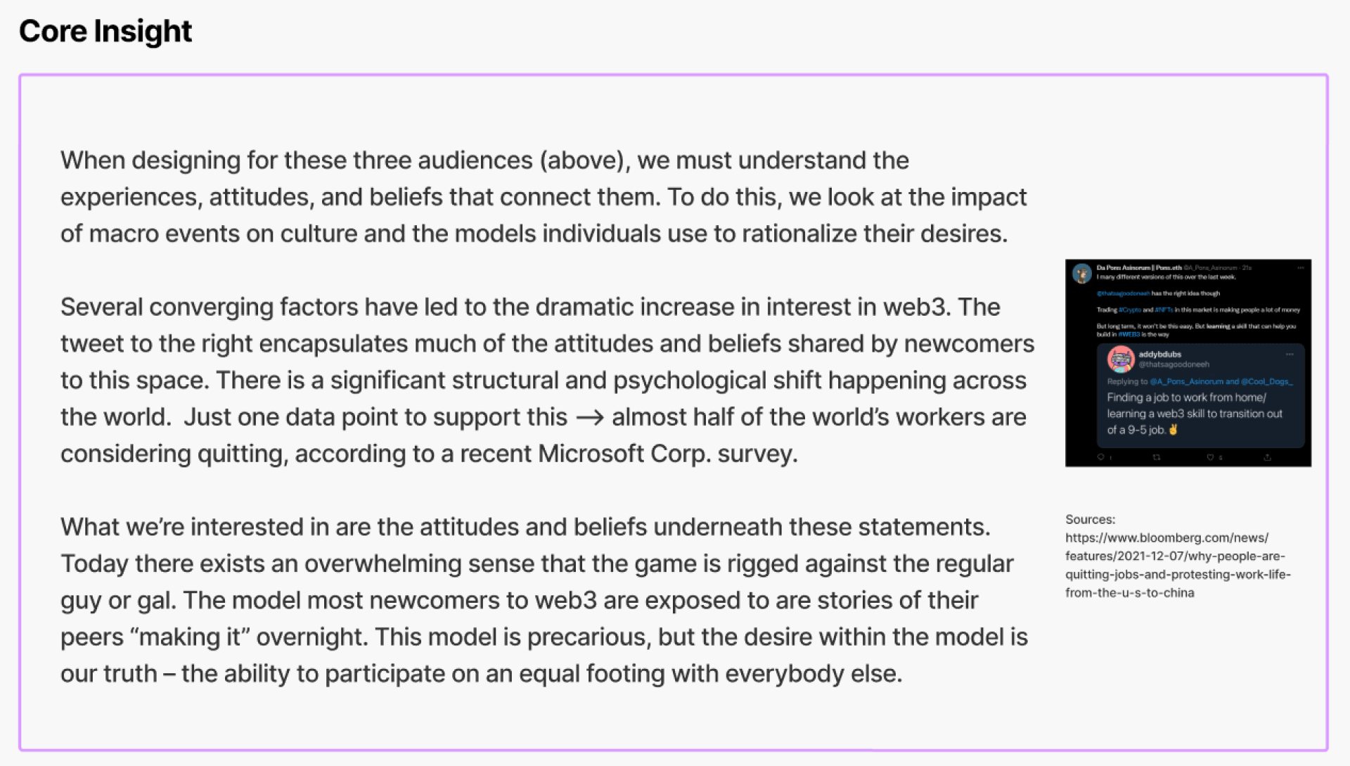 He also came up with an insightful creative brief. This started with diving deep into people's increased interest in Web3. An immense structural and psychological shift factored in this (e.g. The Great Resignation); beneath this shift is the desire to be equal with everyone else.