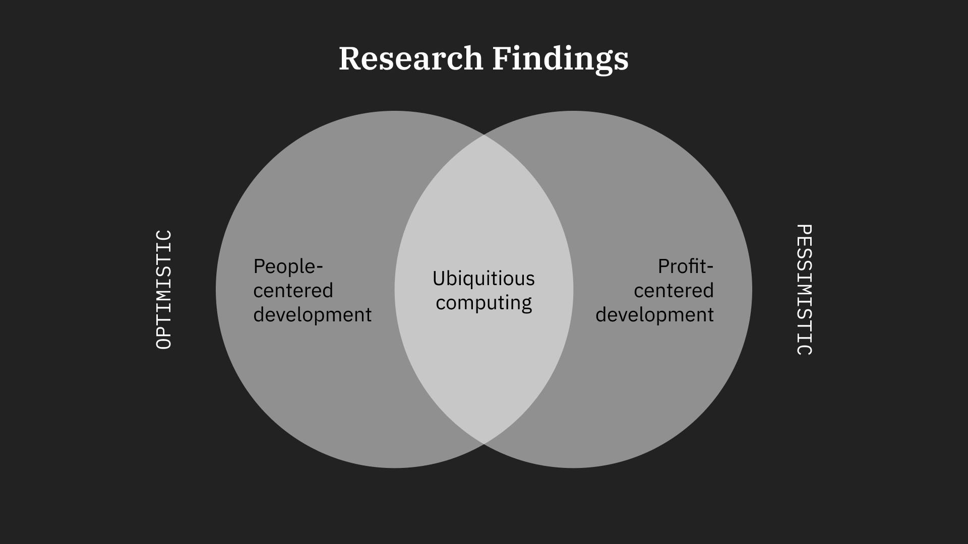 Based on the interviews, Filipinos expect to see ubiquitous computing in a future Philippines, whether it is optimistic and pessimistic. What differentiates the optimistic and pessimistic scenarios is their motivation for development; the former is centered around the people, while the latter is centered around profit. And while the probable scenario contains elements from both scenarios, it leans more towards the pessimistic, reflecting a prevailing sense of cynicism amongst Filipinos.