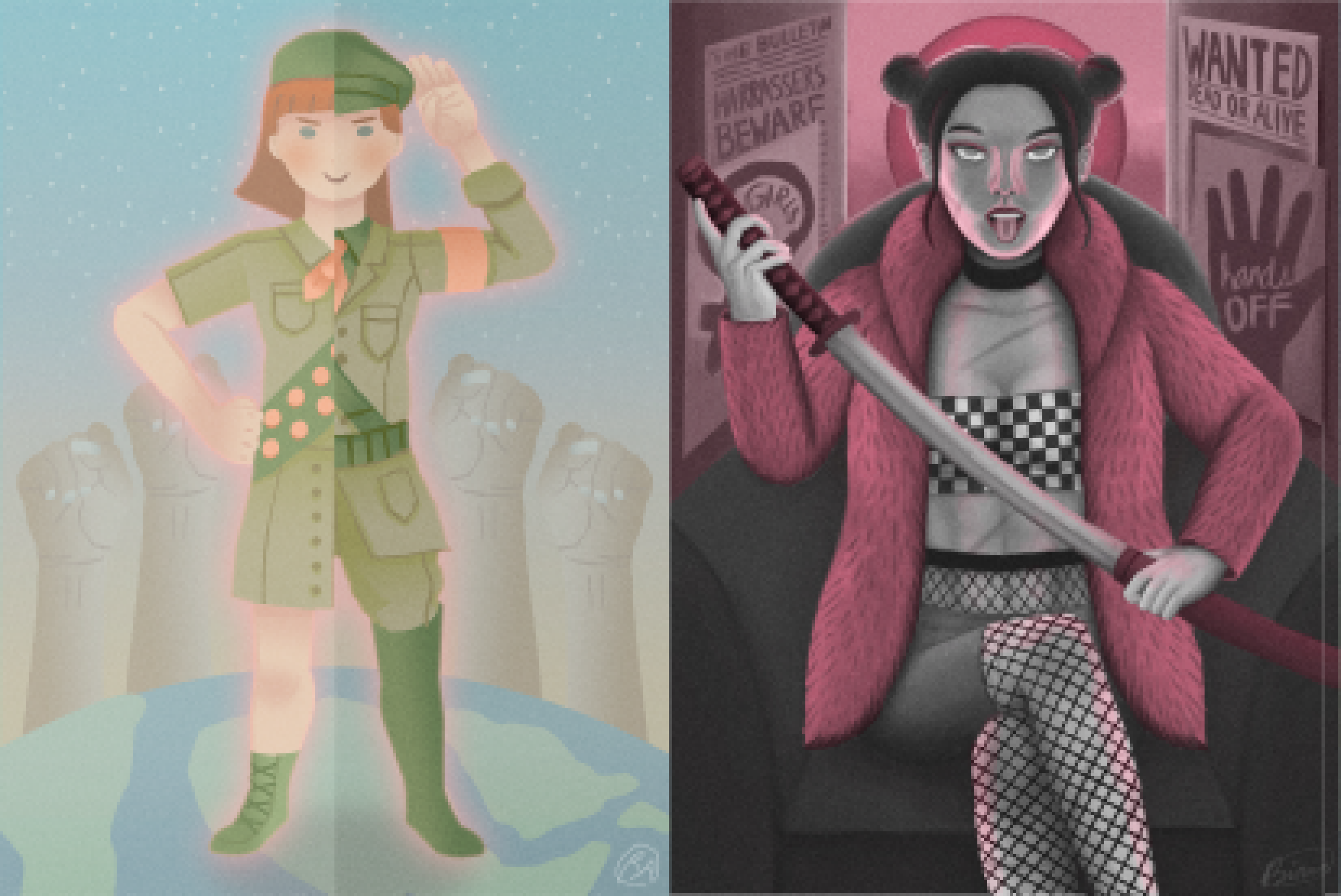 Inspiration is derived from girls who strive to succeed in a world designed to be against them. Pastel colors play an element of feminity for girls who do not need to embody constructs of masculinity in order to exude power. A scout and a soldier was shown in the belief that both can embody girl power. The background illustrates an ideal world: one of solidarity.