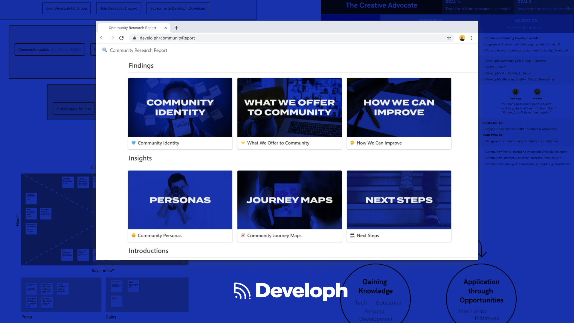 First, we created a survey. Questions were centered around themes of identity, experience, and structure, taken from the Community Canvas framework. This was then disseminated in the Facebook group. We then contacted respondents who opted in for a 1-hour interview. Finally, the Developh team worked together to analyze and cluster the data we gathered through affinity mapping.